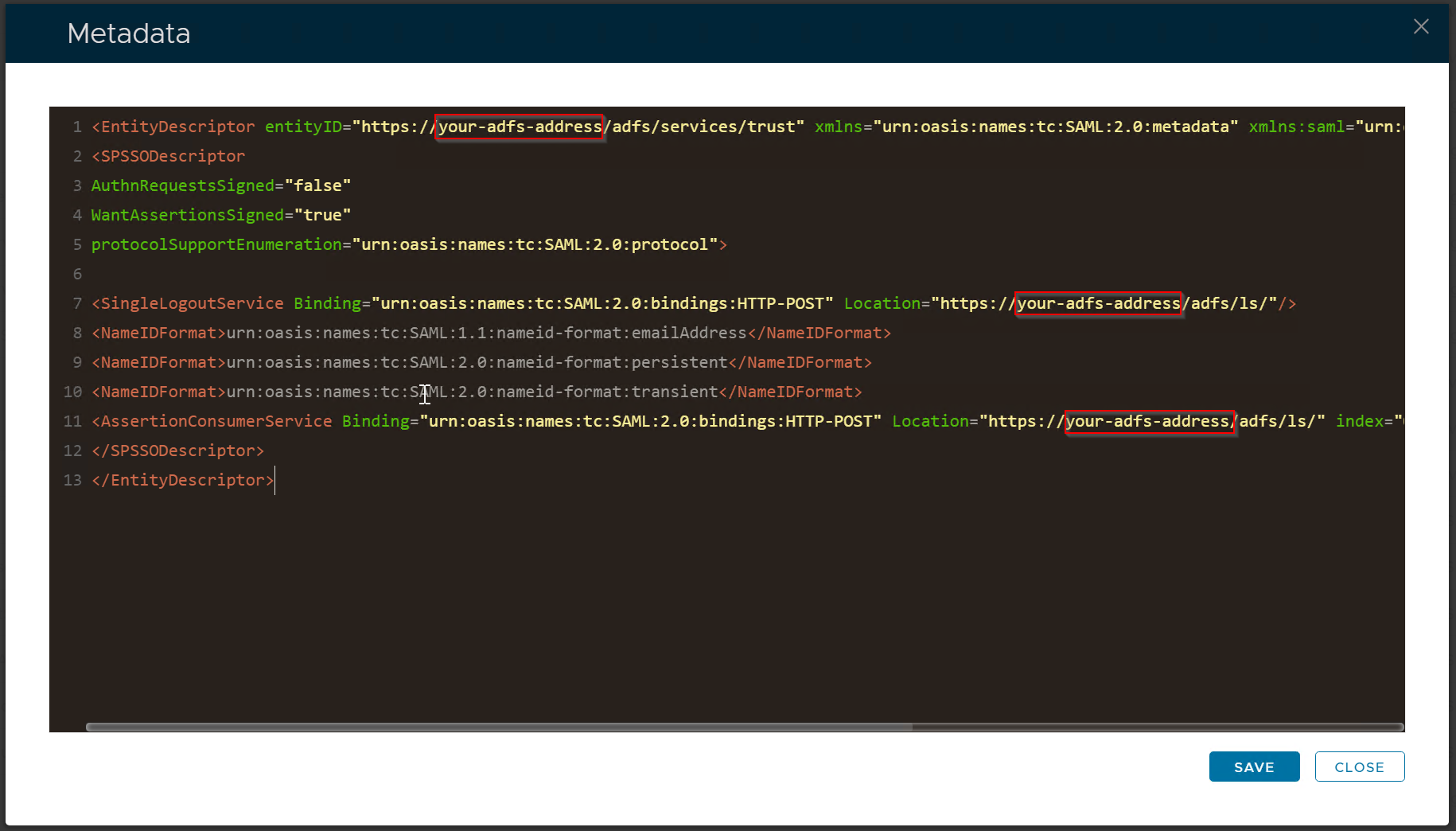 <EntityDescriptor entityID="http://your-adfs-address/adfs/services/trust" xmlns="urn:oasis:names:tc:SAML:2.0:metadata" xmlns:saml="urn:oasis:names:tc:SAML:2.0:assertion" xmlns:ds="http://www.w3.org/2000/09/xmldsig#"> <SingleLogoutService Binding="urn:oasis:names:tc:SAML:2.0:bindings:HTTP-POST" Location="https://your-adfs-address/adfs/ls/"/> |