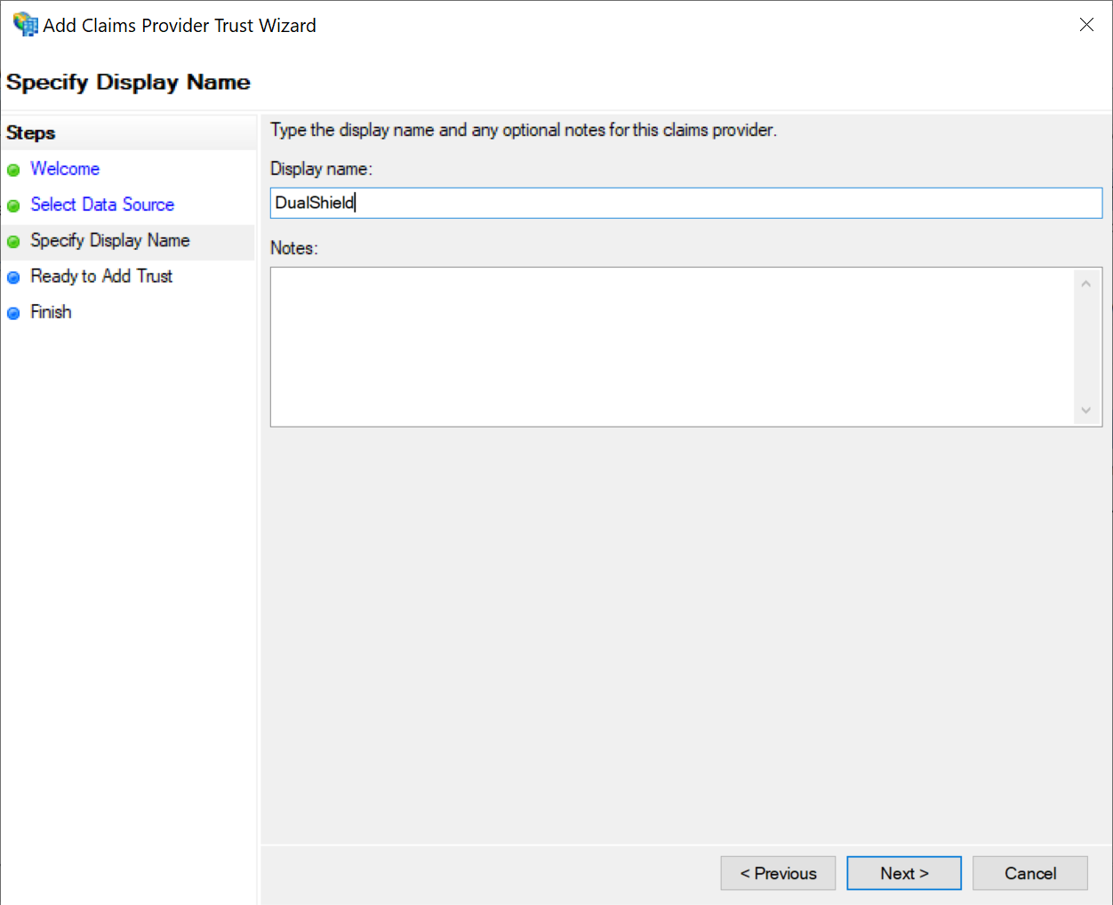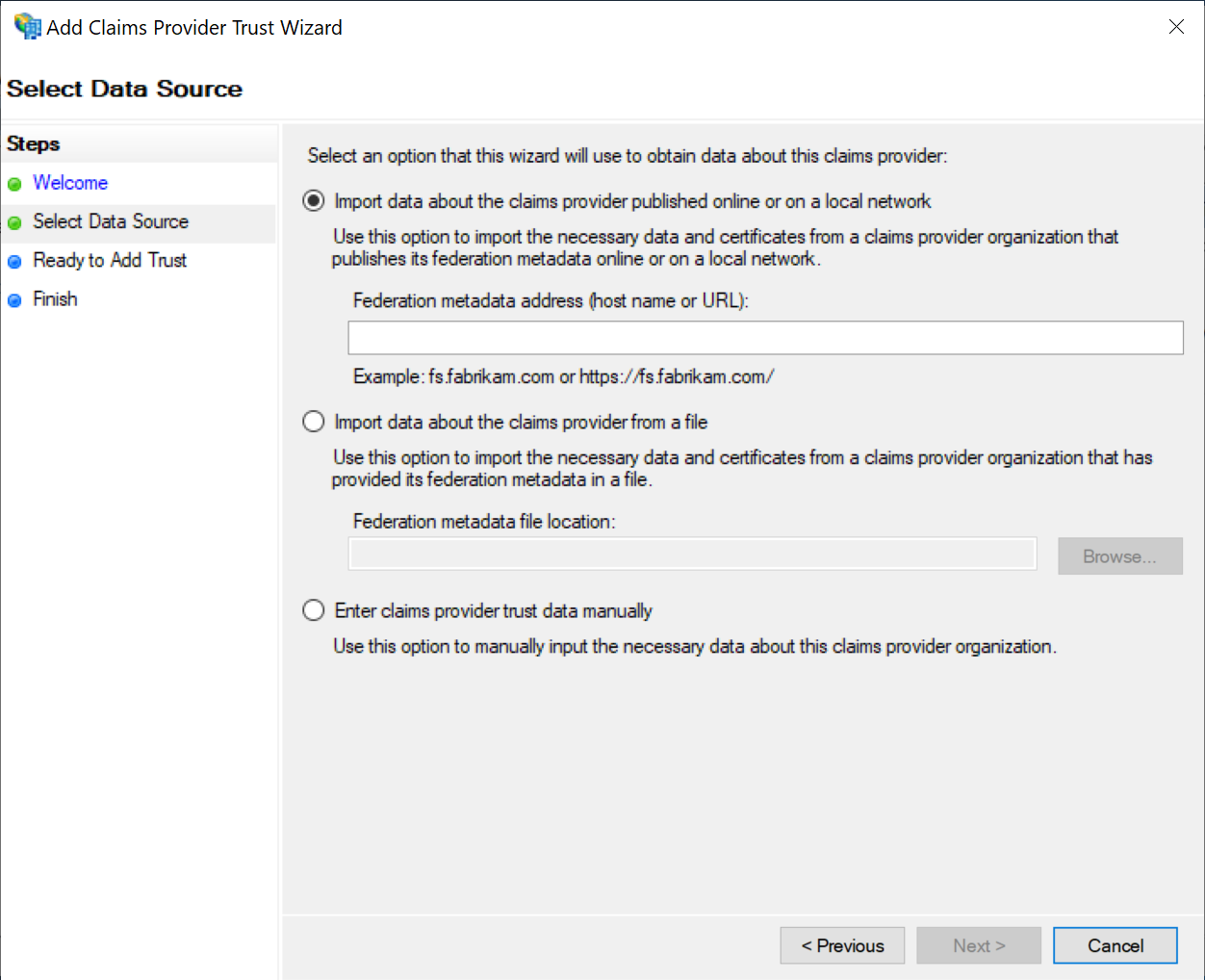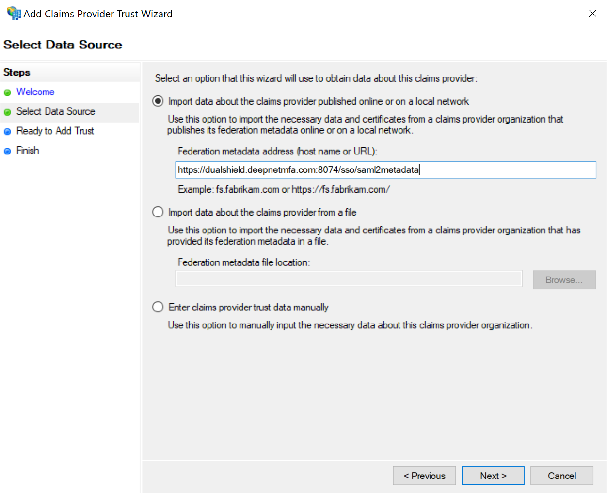DualShield publishes its metadata to a standard URL (https://your-dualshield-fqdn:8074/sso/saml2metadata).If this URL is accessible from the ADFS server, then select the option "Import data about the claims provider published online or on a local network". Otherwise, select "Import data about the claims provider from a file"
