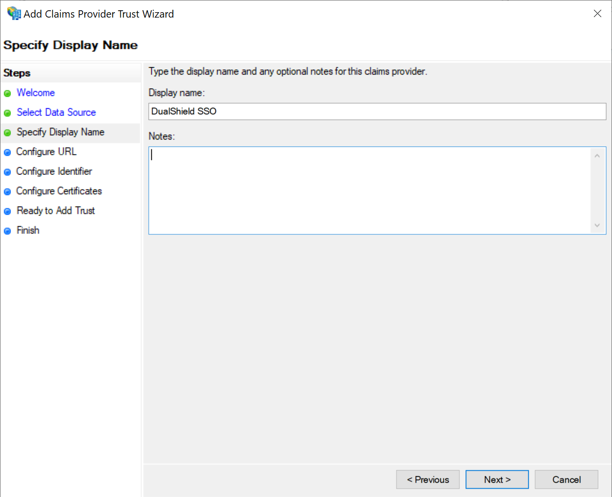 In the Claims provider trust identifier box, enter the Entity ID of your DualShield SSO server, e.g. urn:deepnet:dual:idp:sso:mfa.fakestop.com