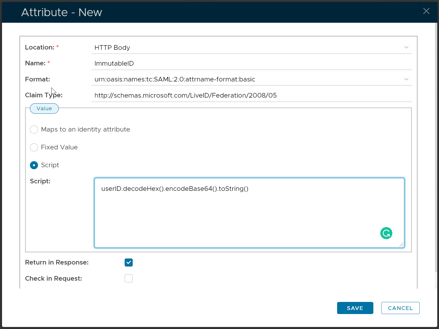 change NameIDFormat to "Map to the following attribute", and Attribute to "ImmutableID".