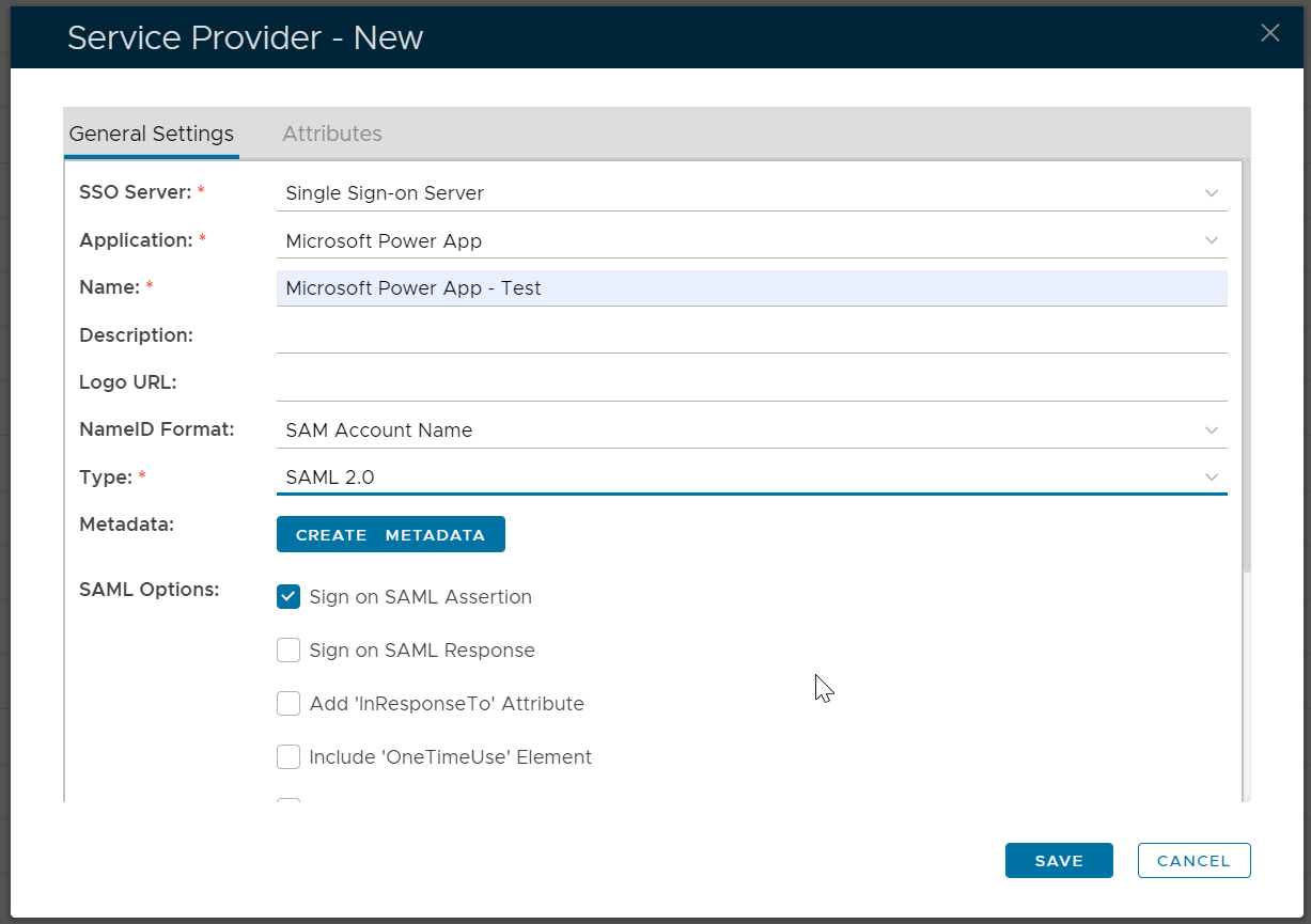 | SAML Options | Enable "Sign on SAML Assertion" |