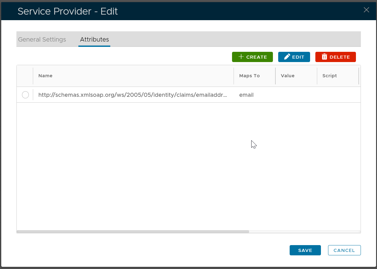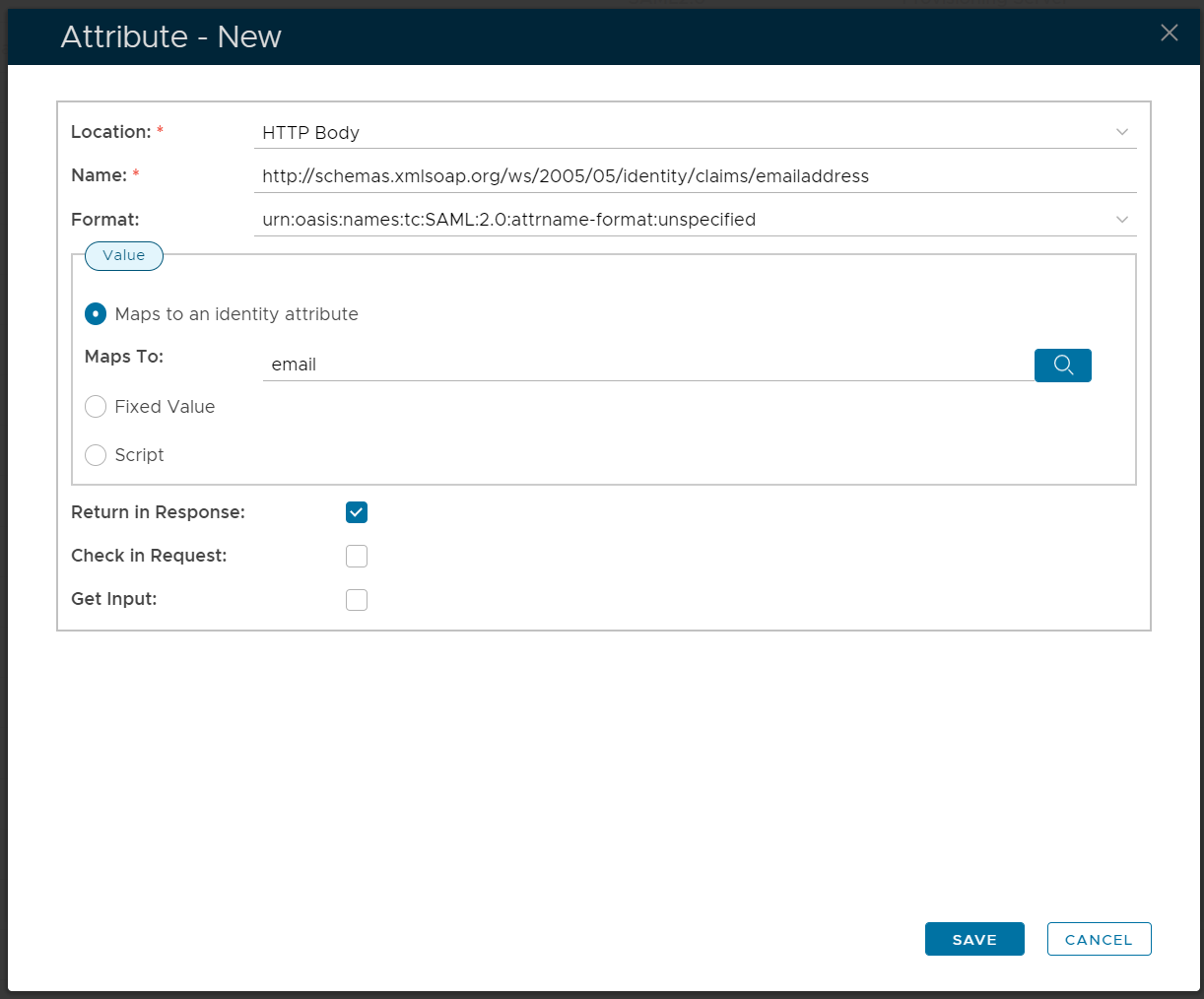 | Format | Choose "urn-oasis:names:tc:SAML:2/.0:attrname-format-unspecified" |