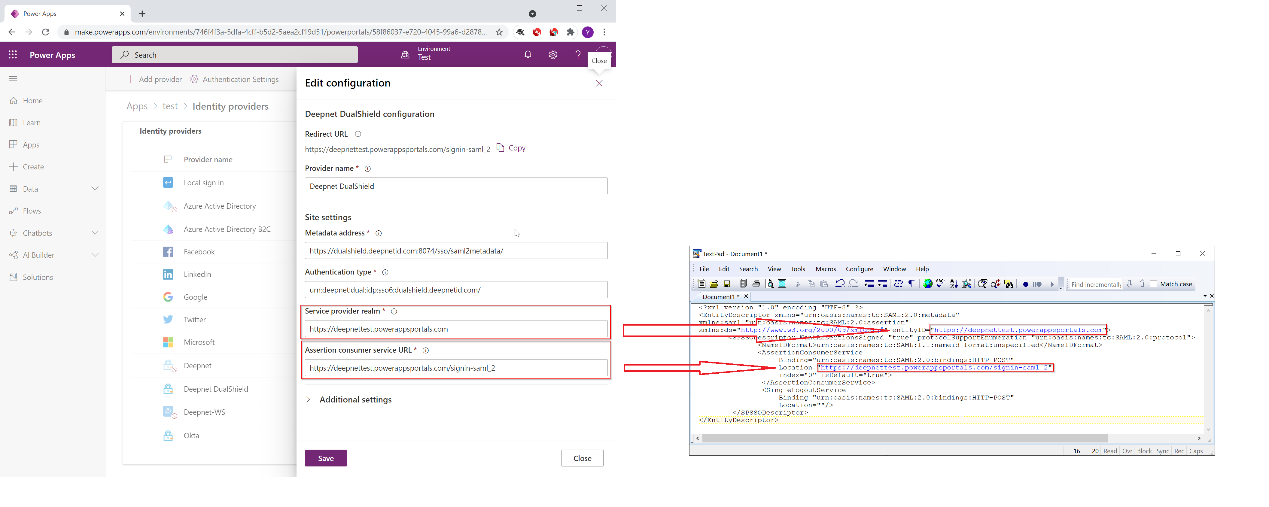 Create the Service Provider (SP) metadata for a Power App using the following template:
