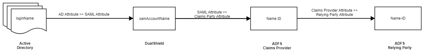 1. AD Attribute → SAML Attribute: DualShield retrieves the user's login name, i.e. "loginName" attribute from AD, then returns it to ADFS as a SAML attribute. Let's call it "samAccountName"