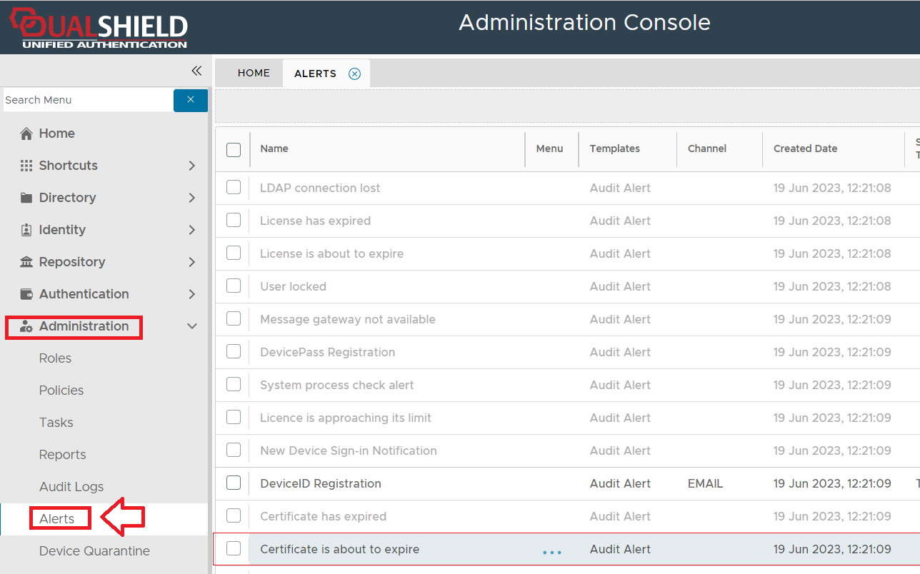 The alert can be found by navigating to "Administration | Alerts", then scrolling down to the alert "Certificate is about to expire";
