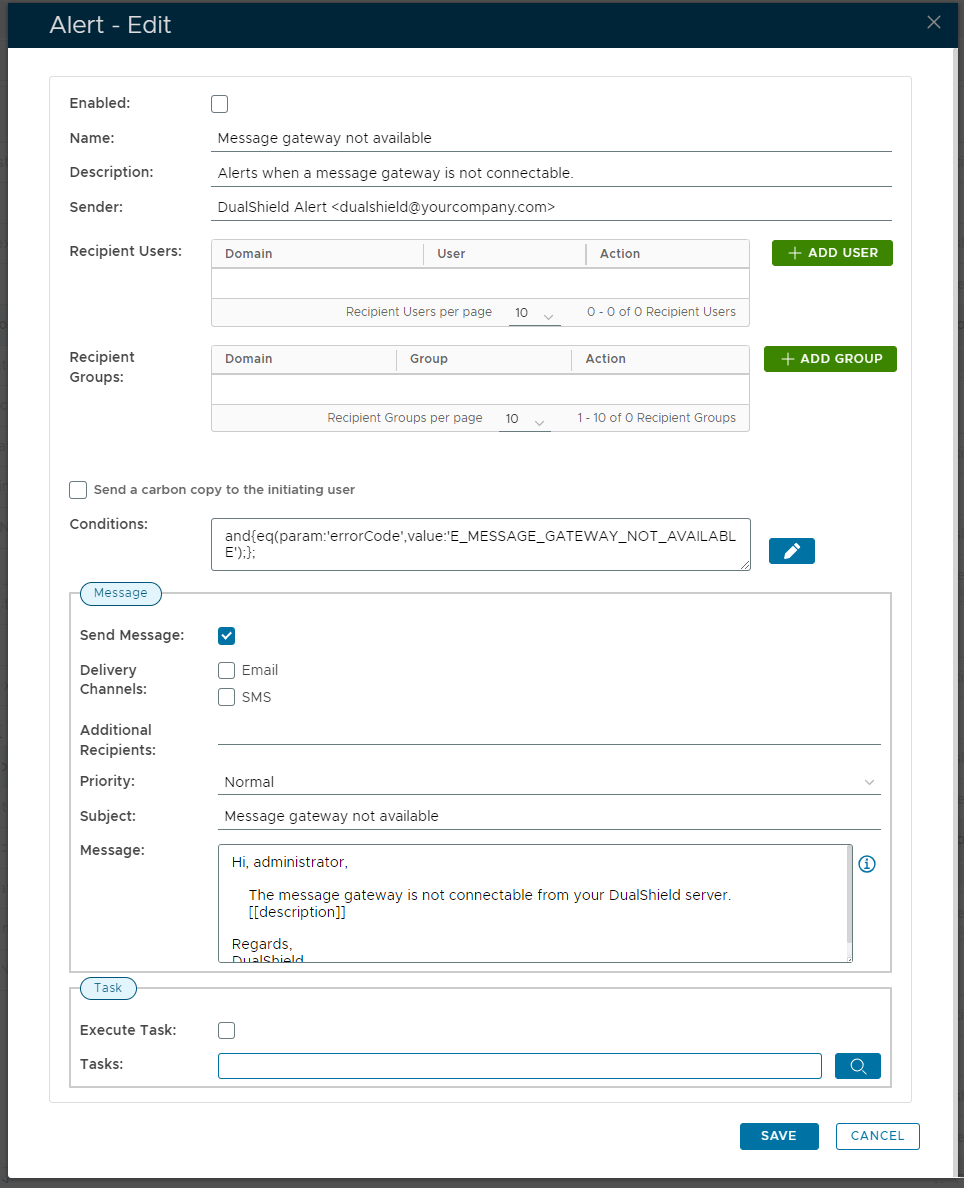 If the alert "Message gateway not available" is enabled, then the alert will be triggered if the conditions details in the alert parameter "Conditions" are met, and are normally triggered that will normally be added to the audit log if the authentication server detects the message gateway have become unavailable.