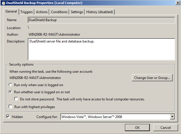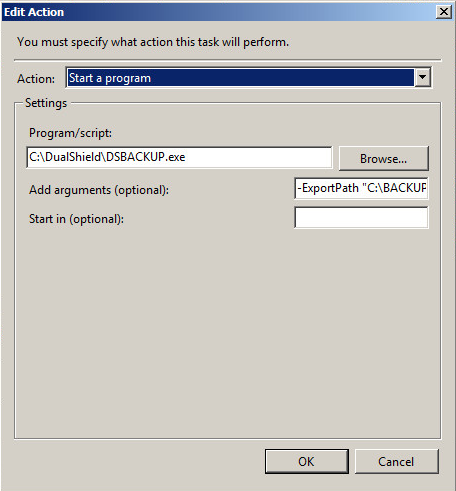 The following instruction illustrates how to use DualShield backup tool with Windows Task Schedule to perform a backup of DualShield data to a specified export folder on a scheduled basis.