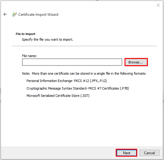 In order to import a certificate into Windows certificate store, you need to access it from the Microsoft Management Console (MMC).