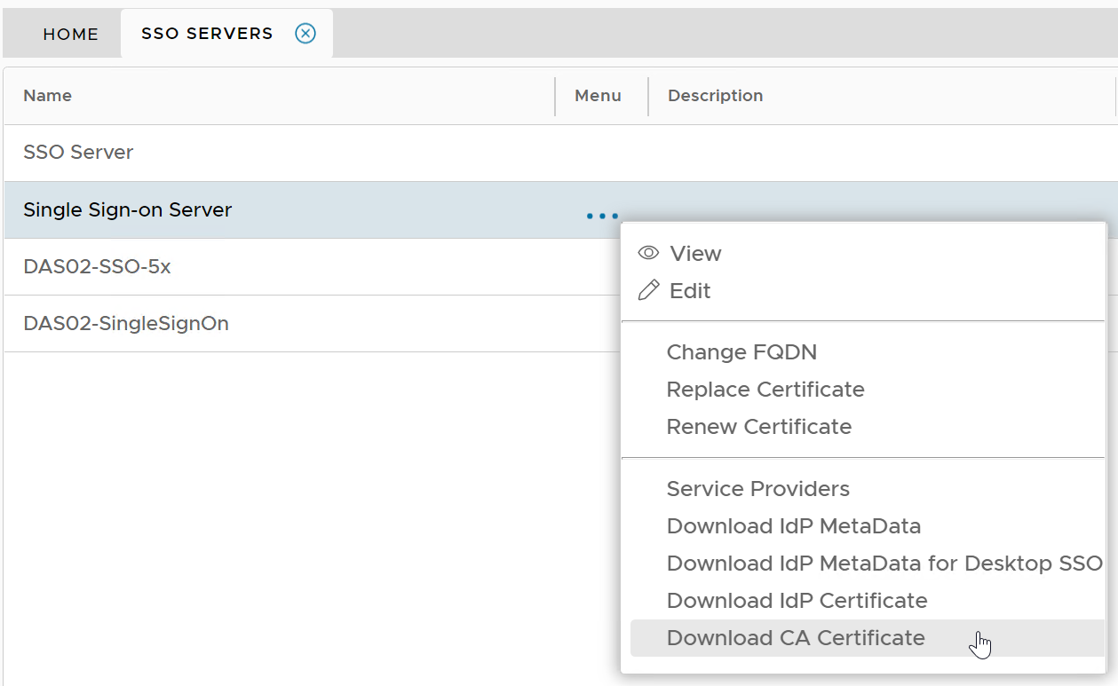 Click the context menu of the Single Sign-on server and select "Download CA Certificate"