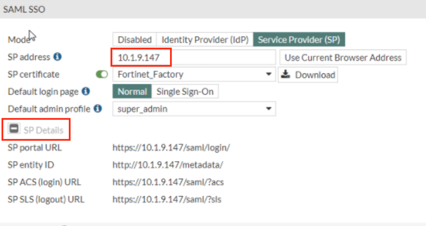 In the SAML SSO Window Specify the SP address. This is essentially the URL or the IP address of the Fortinet UI you wish to log onto.