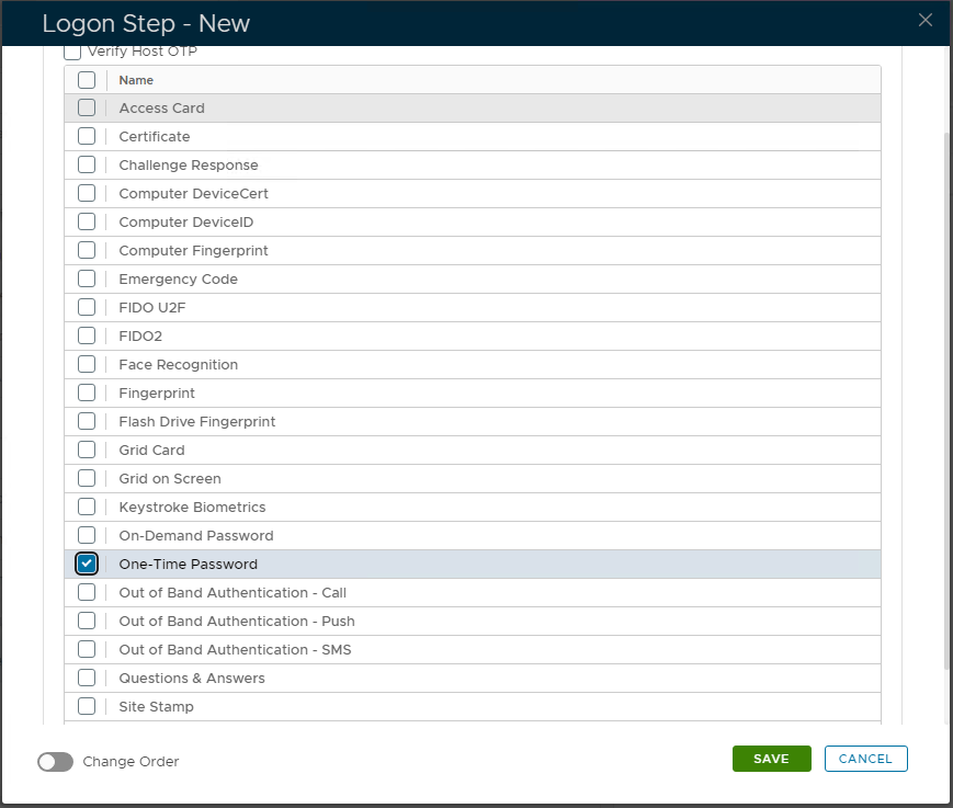 8. Select the authentication methods, i.e. “One-Time Password”