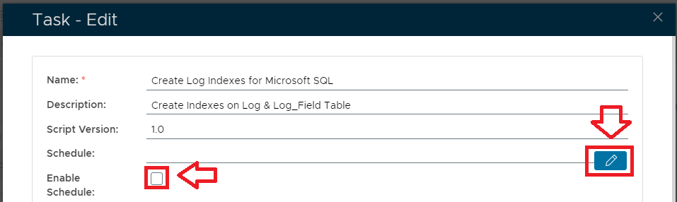 Select the "Enable Schedule" checkbox to ensure the task schedule is activated, then use the pencil icon ("") to specify the time and frequency settings for automated task execution.