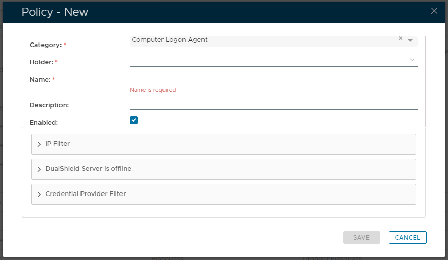 To create a new Computer Logon Agent Policy click on the button, and a new window titled "Policy - New" will now open;