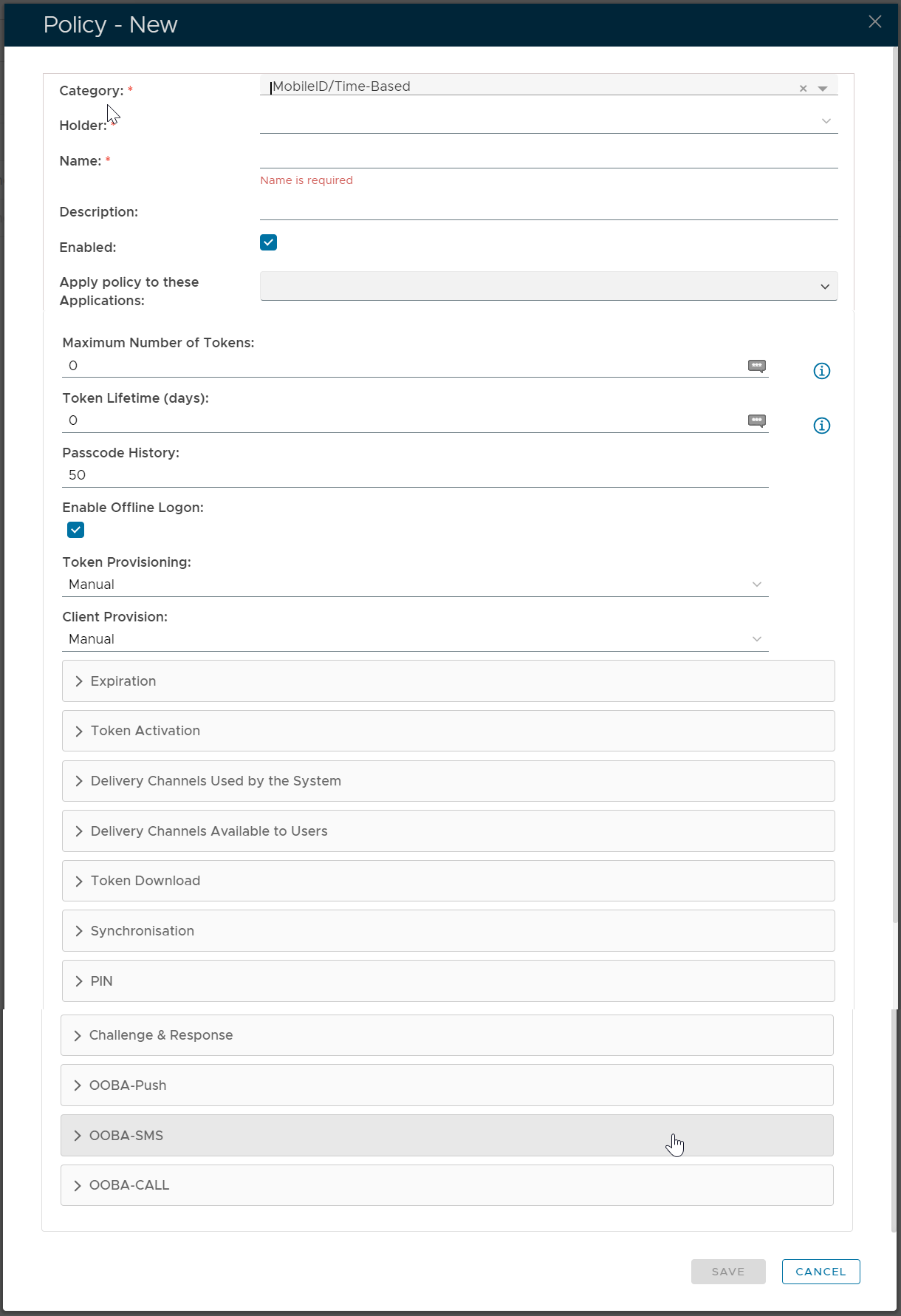 In the policy editor, firstly select MobileID/Time-Based from the Category drop-down list