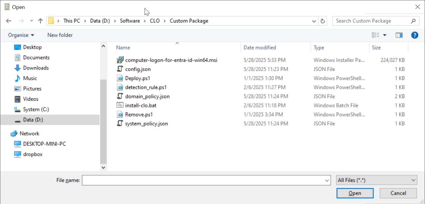 Navigate to the folder where the files are kept, e.g. "D:\Software\CLO\Custom Package"