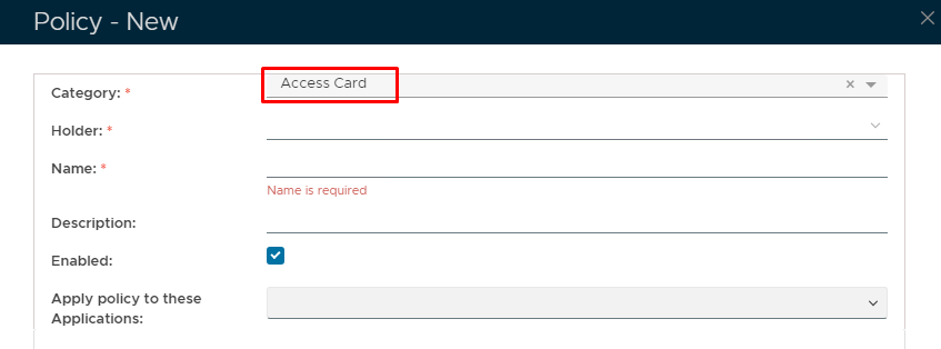 The policyholder defines the scope of the policy. Optionally, you can bind the policy to a specific application or a list of applications. To specify the application(s), select the field: Apply policy to these applications If the field Apply policy to these applications is left empty, then the policy will be applied to all applications. Enter or select the following policy bindings:Holder: Name: A unique name that describes this policy Applications: