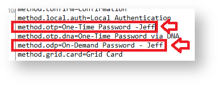 In the example below I have changed the displayed names for the authentication methods "On-Demand Password" and "One-Time Password";