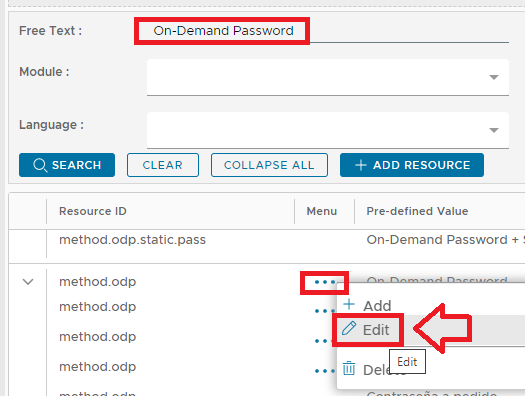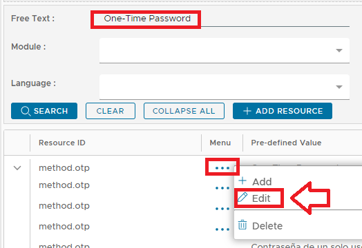 As an example, to find the prompt displayed for the authentication method "One-Time Password", at the filter "Free Text:" we either supply "One-Time Password", or "method.otp", then click the "SEARCH" button to find the required resource to be customised.
