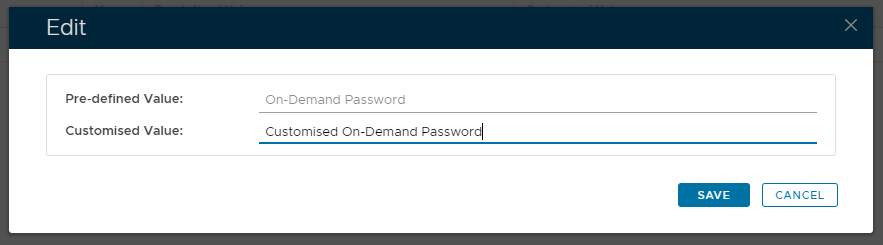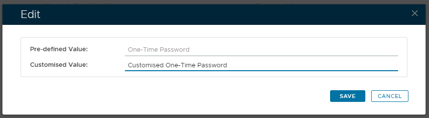 At the prompt "Customised Value" you can now supply the customised text that will replace the default name for the selected authentication method then click "SAVE".