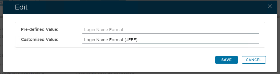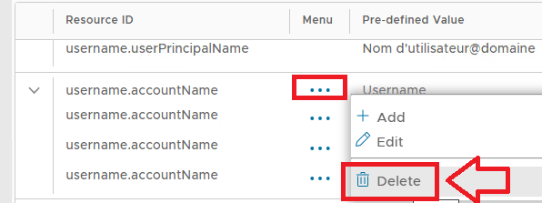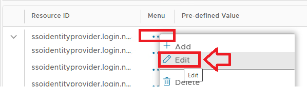 From the list above I have already customised the first item ("Login Name Format"). Customisation is performed by left clicking on the context menu of the Resource to be edited then selecting "Edit";