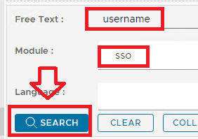 We start by selecting the module "SSO" and providing "Username" at the prompt "Free Text", then clicking "SEARCH";