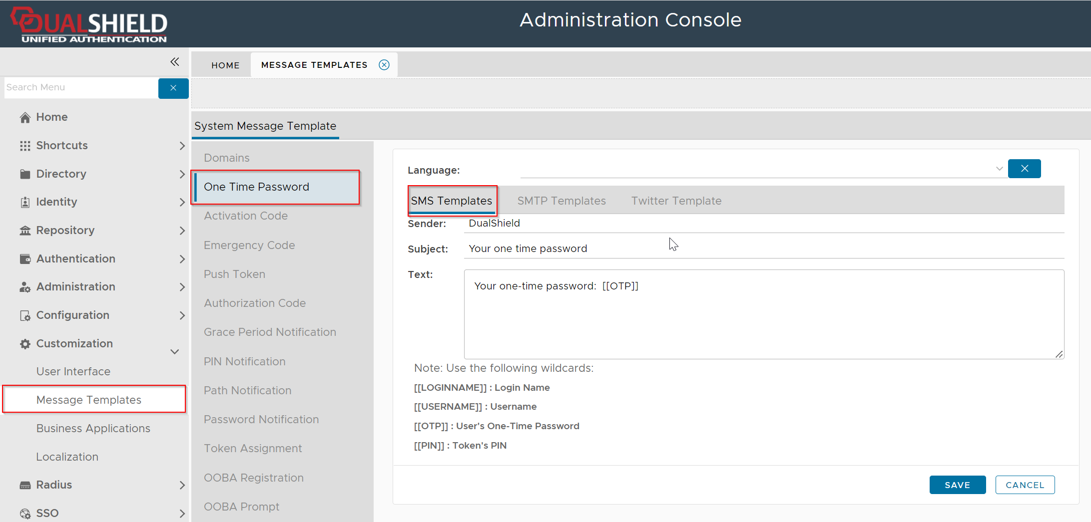 When the DualShield server sends out an SMS passcode, it uses a message template named "One Time Password" to formulate the content of the message. You can customize the template.