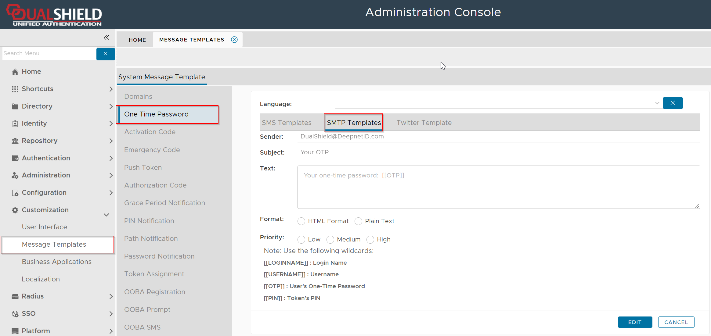 Navigate to Customization | Message Templates | One Time Password | SMTP Templates