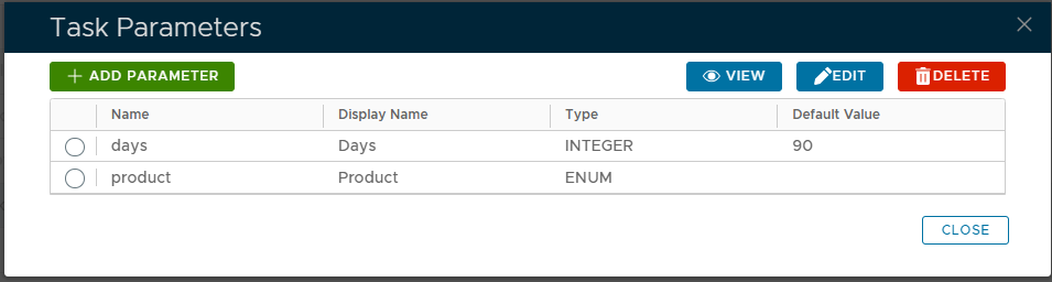 A new window titled "Task Parameters" will now open that lists the parameters that have been created for this task (see example below);