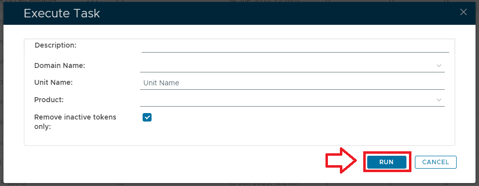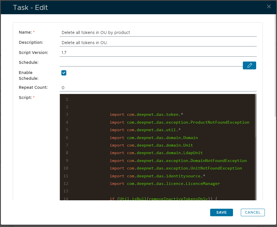 The purpose of this task is to remove all tokens from the token repository of a specific product and manufacturer, that have been assigned to users in a specific organisational unit and domain (optionally, token deletion can be further restricted to inactive tokens).