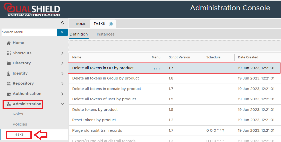 The task can be found by navigating to "Administration | Tasks", then scrolling down to the task "Delete all tokens in OU by product";