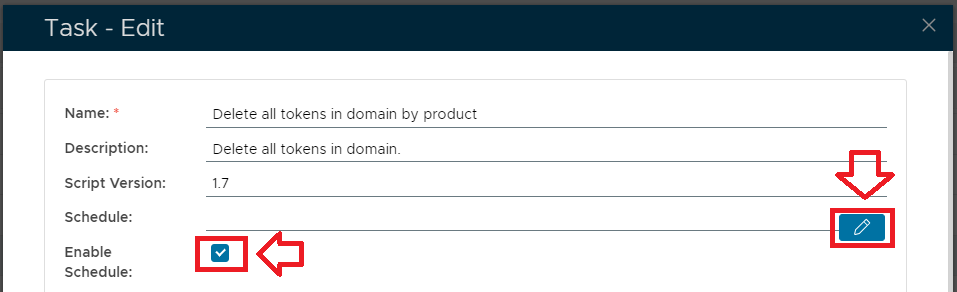 Select the "Enable Schedule" checkbox to ensure the task schedule is activated, then use the pencil icon ("") to specify the time and frequency settings for automated task execution.