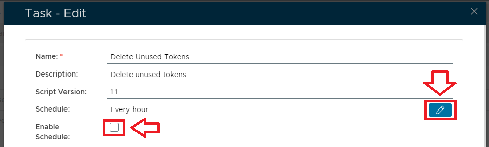Select the "Enable Schedule" checkbox to ensure the task schedule is activated, then use the pencil icon ("") to specify the time and frequency settings for automated task execution.