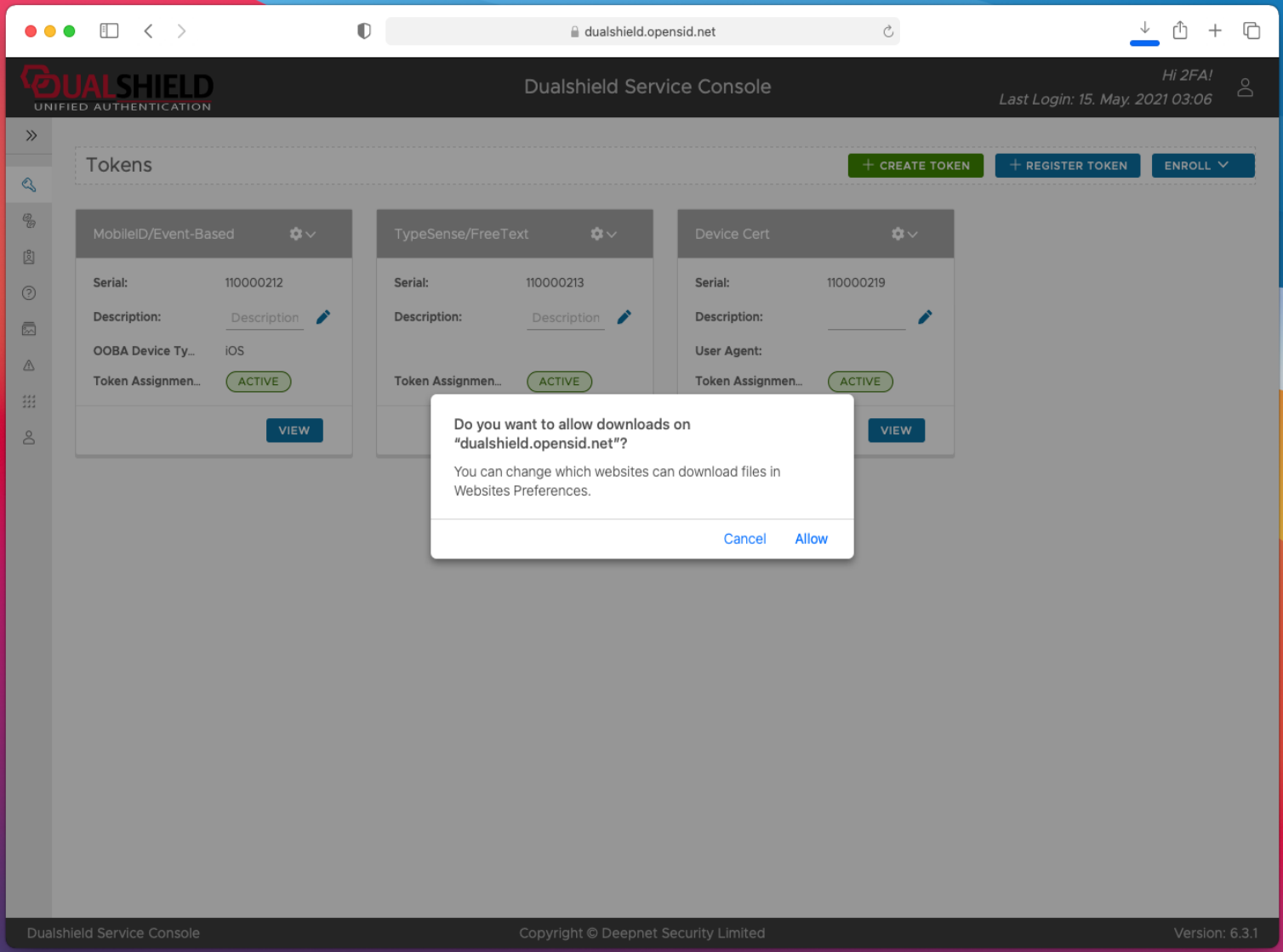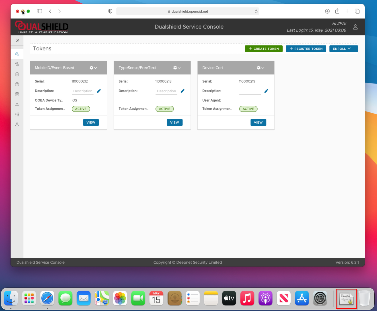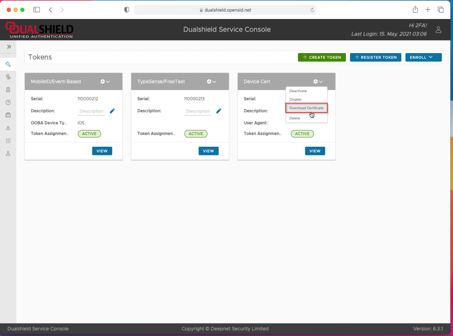 For instance, sign in to your DualShield Service Console, find the DeviceCert token, click "Download Certificate" from its context menu: