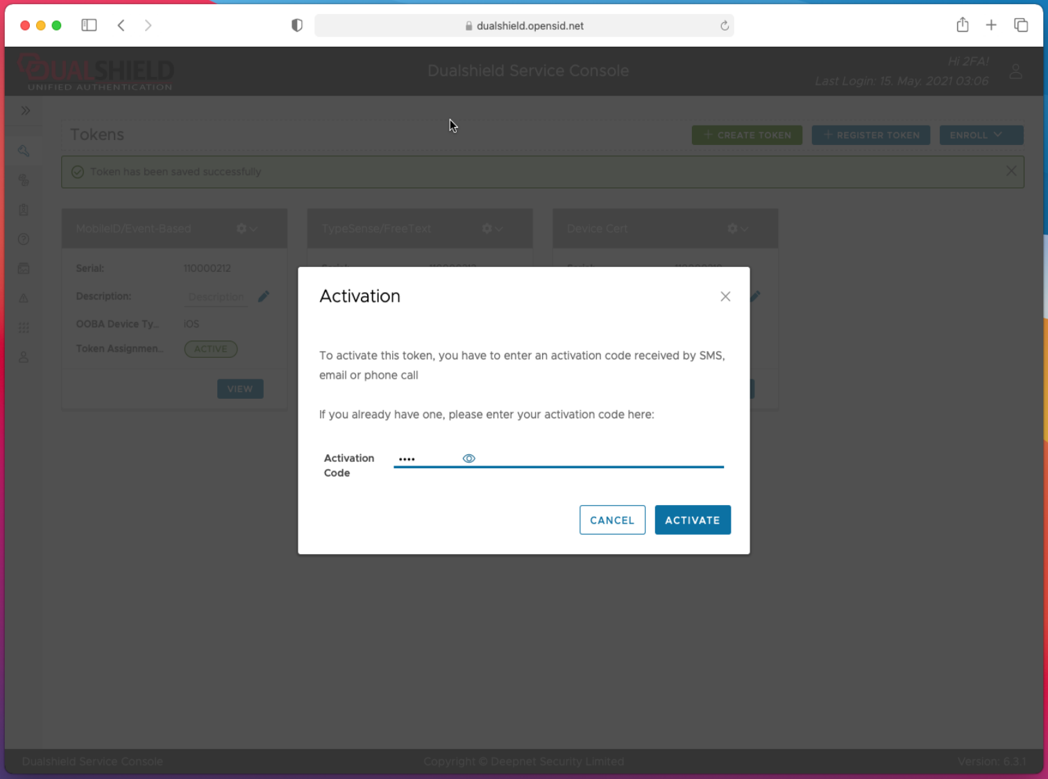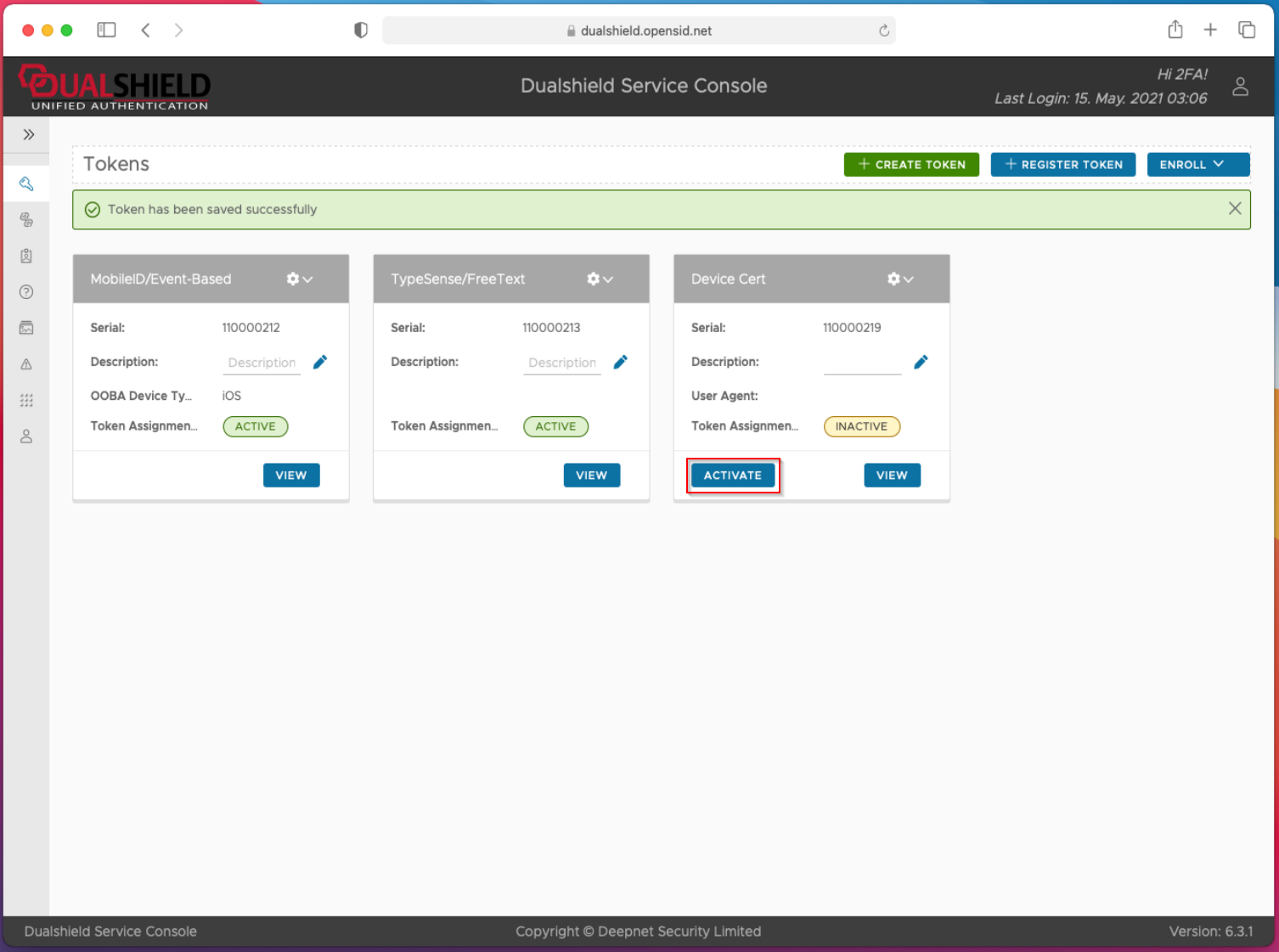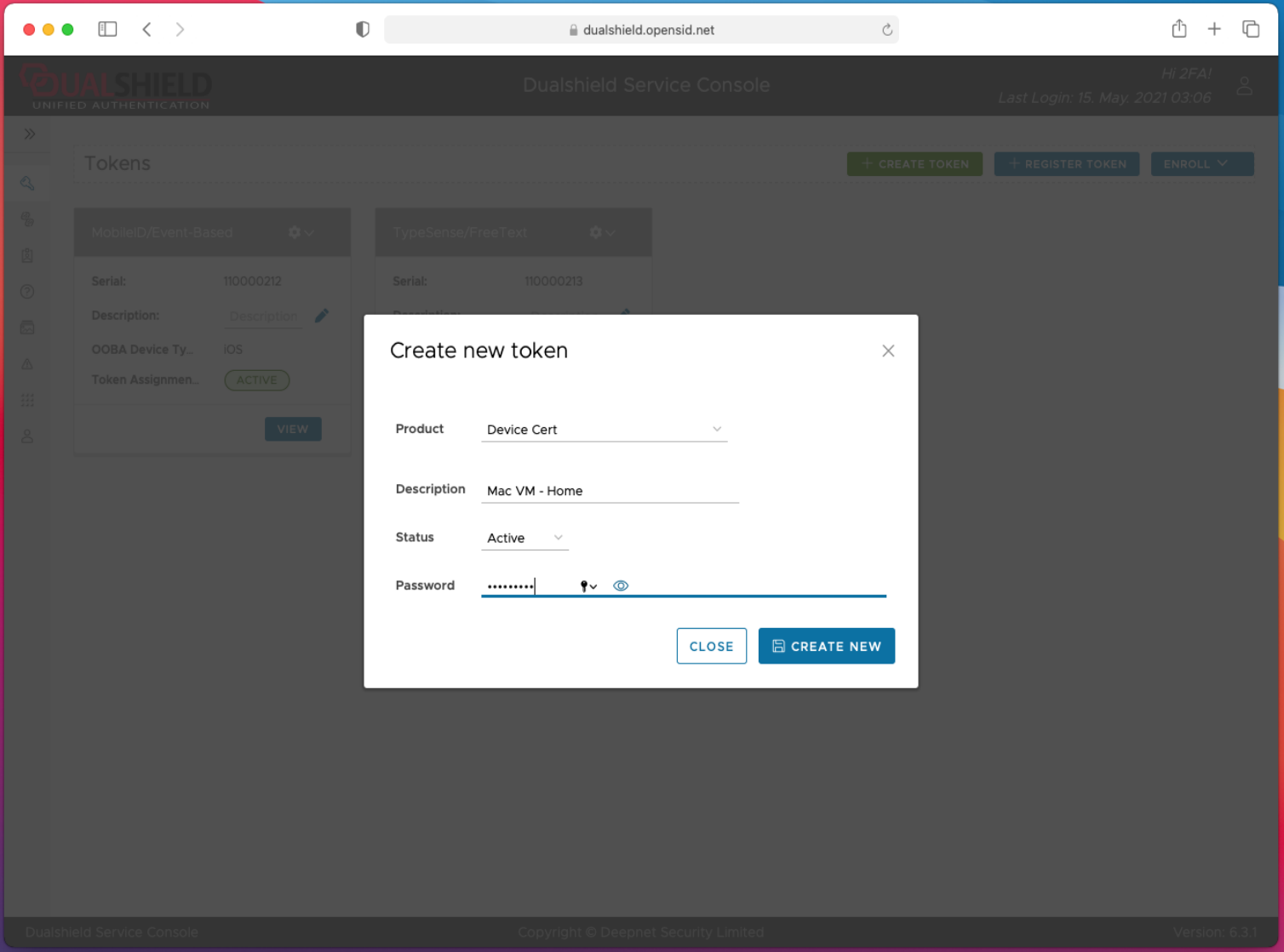 For instance, sign in to your DualShield Service Console, find the DeviceCert token, click "Download Certificate" from its context menu: