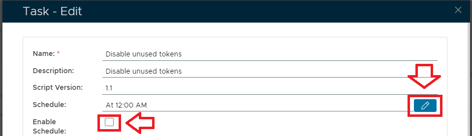 Select the "Enable Schedule" checkbox to ensure the task schedule is activated, then use the pencil icon ("") to specify the time and frequency settings for automated task execution.