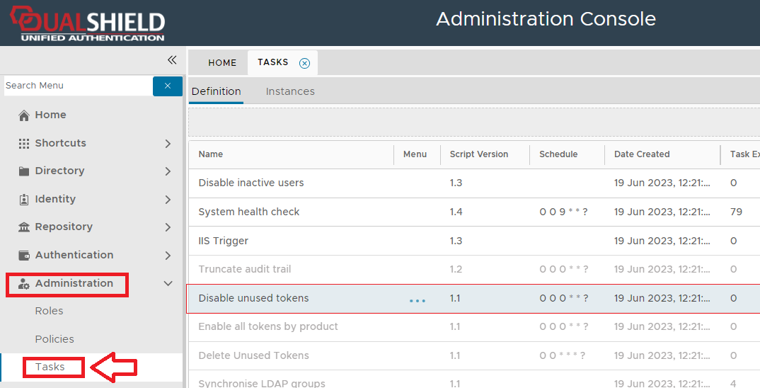 The task can be found by navigating to "Administration | Tasks", then scrolling down to the task "Disable unused tokens";