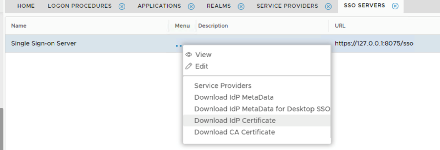 2. Click the context "..." menu corresponding with the SSO Server you are using (Single Sign-on Server) and select option "Download IdP Certificate".