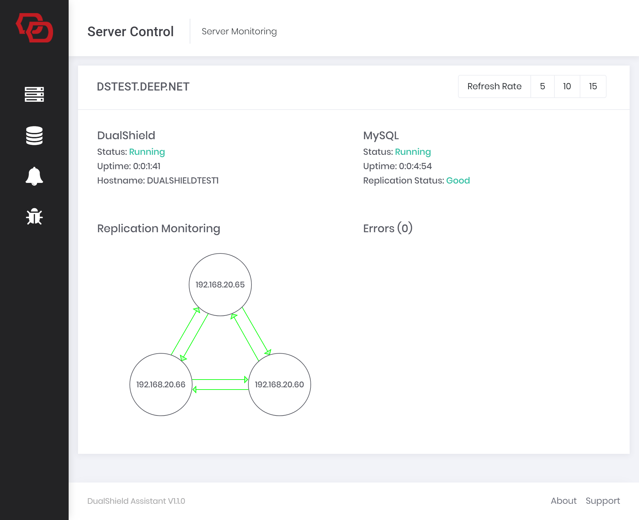 DualShield Assistant is optional companion software to the DualShield Authentication Server, specifically made for environments where MySQL database replication is being used with DualShield. It provides system administrators with a monitoring interface to view the current status of the replication cluster as well as notifying by email if any network or replication errors occur. DualShield Assistant can also be used to clone an existing DualShield installation and setup a new replication cluster.