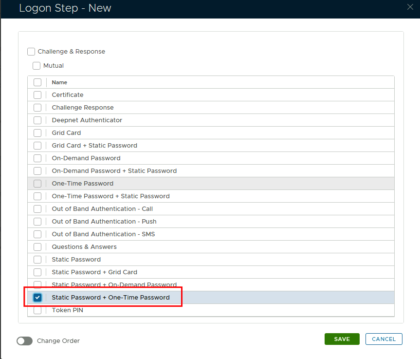 8. Select the desired authentication method, e.g. “Static Password + One-Time Password”