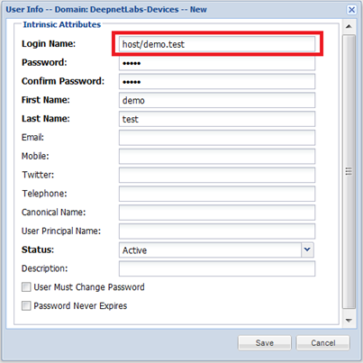 Enter the Login Name in the form of "host/xxx", where "xxx" is the subject CN of the device certificate, e.g. "demo.test", the rest fields in the form are insignificant. Import device cerficate
