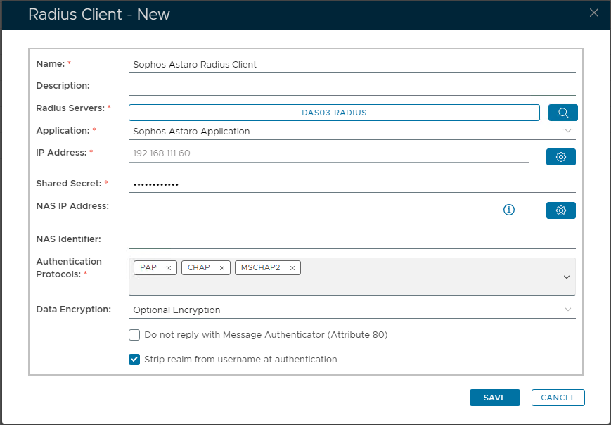 - Click the “+ CREATE" button in the toolbar, to create a Radius Client.