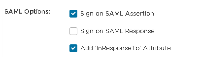 20. Within 'SAML Options' enable tickbox options "Sign on SAML Assertion" and "Add 'InResponseTo' Attribute":