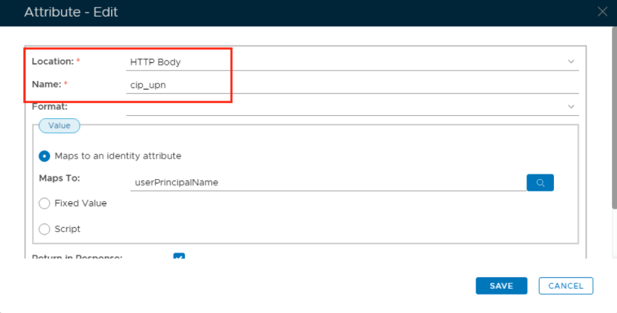 23. On the Attributes builder specify Location as HTTP Body and enter cip_upn as the name for this attribute.