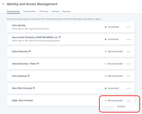 9. Click the Ellipsis (…) next to SAML, then click "Connect" from the drop-down option.