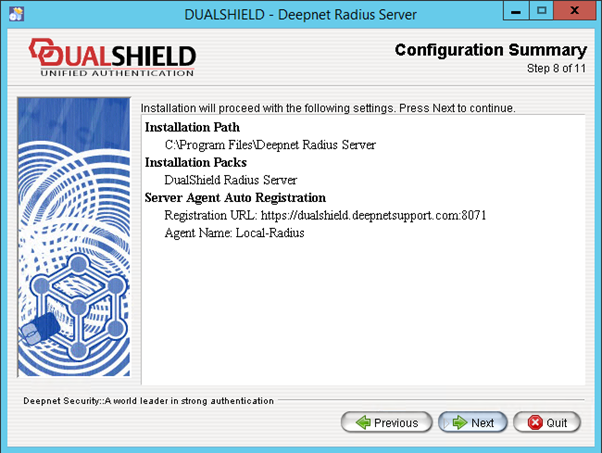 To install the DualShield Radius Server, launch the installer DualRadiusSetup.exe and go through the following steps: