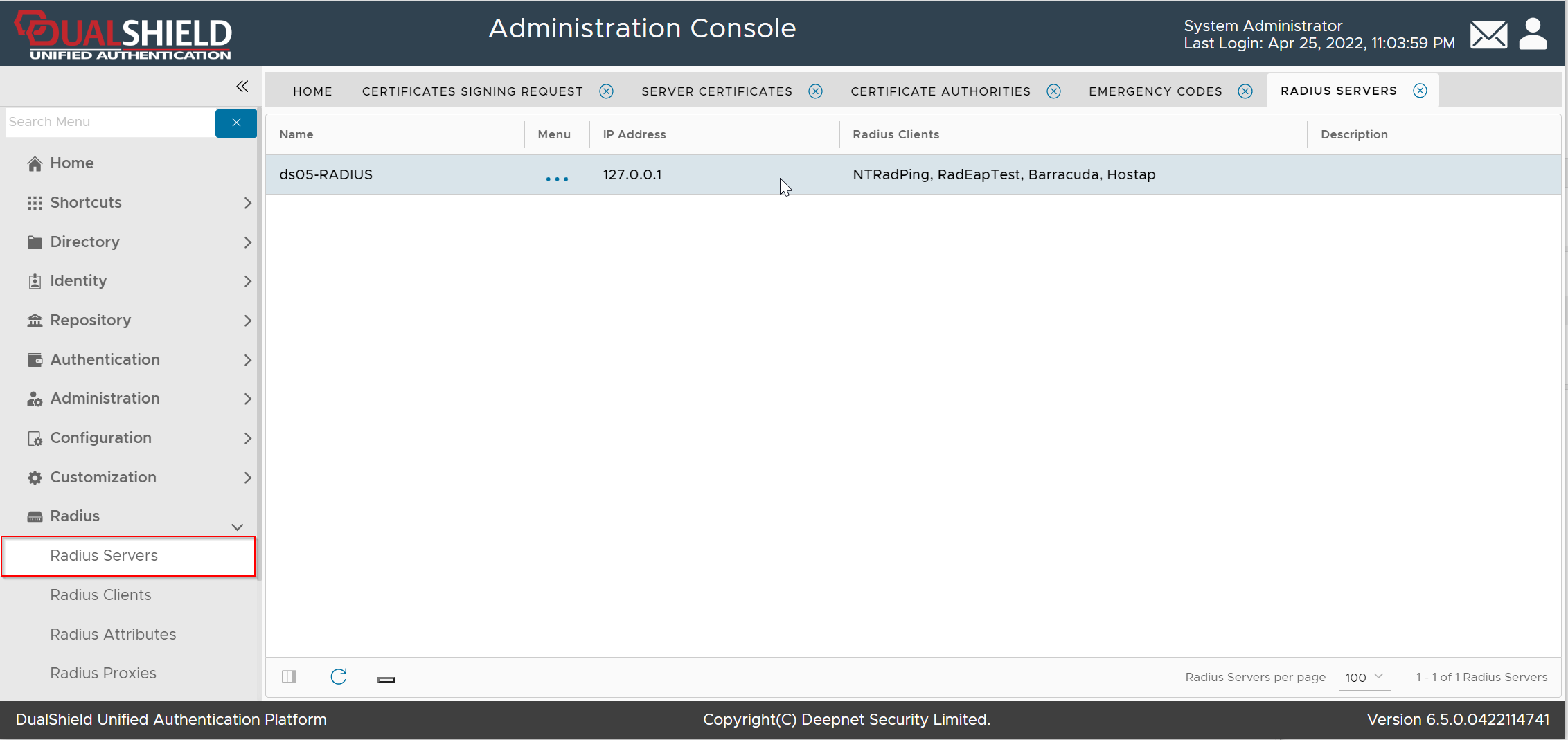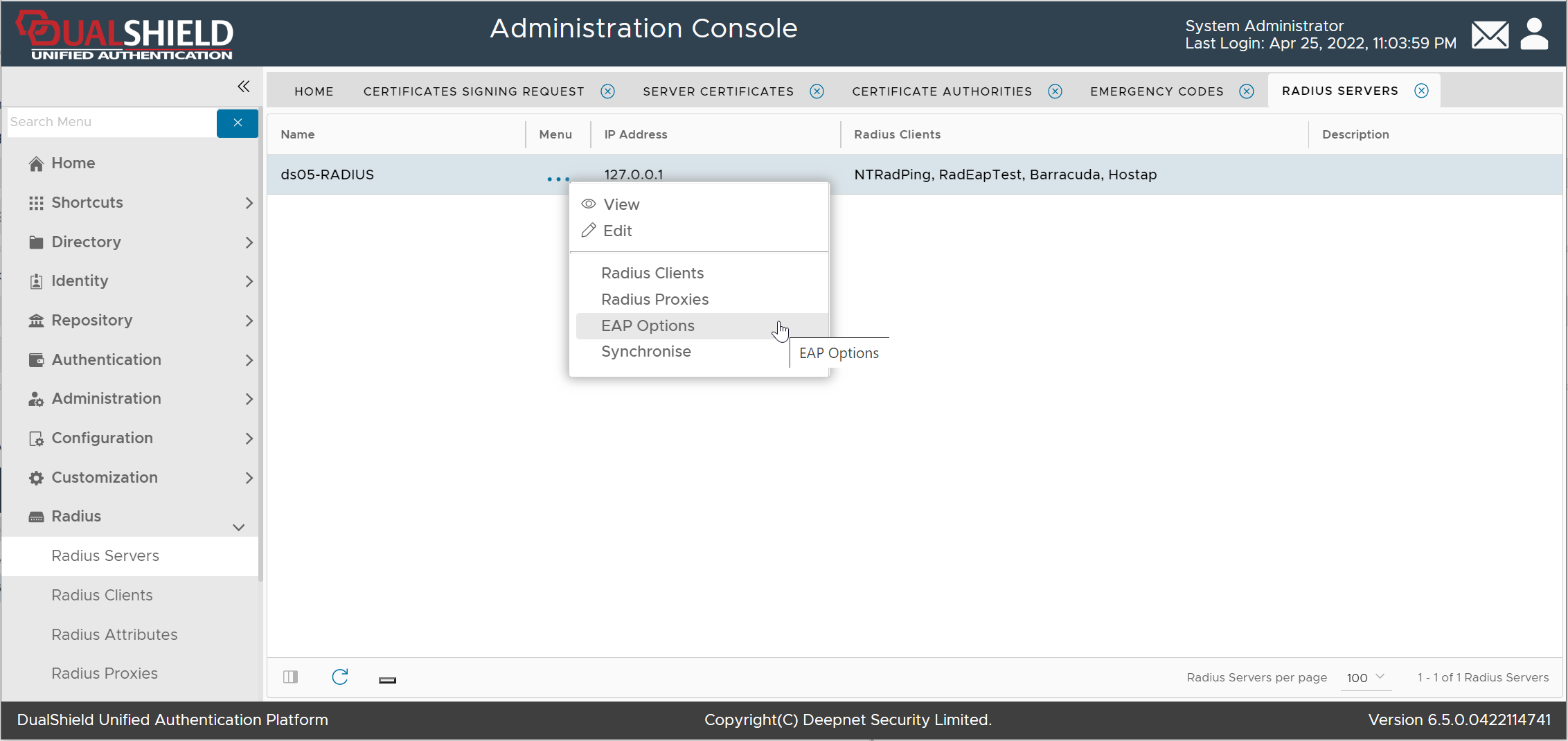 Click the context menu of the RADIUS server