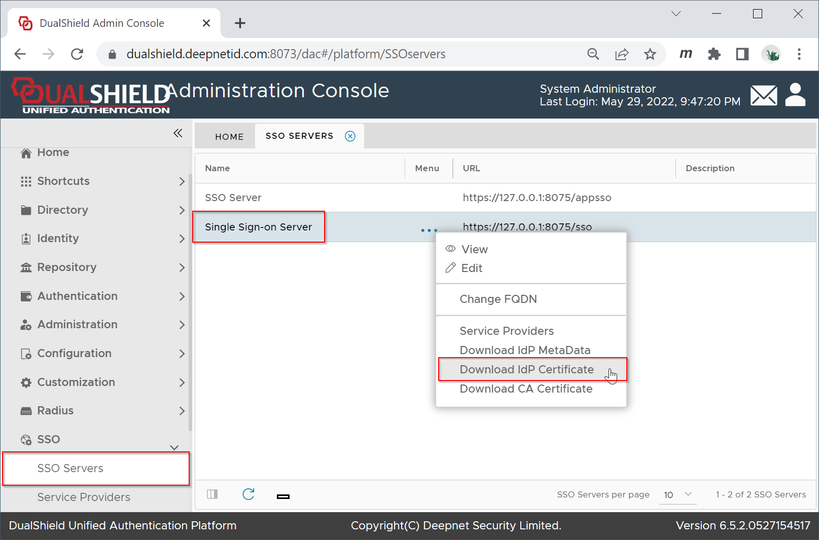 Click the context menu of the Single Sign-on server and select "Download IdP Certificate"