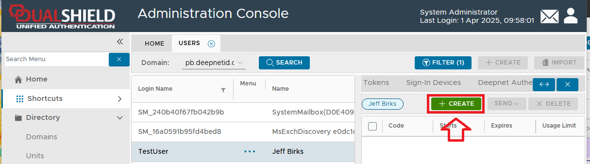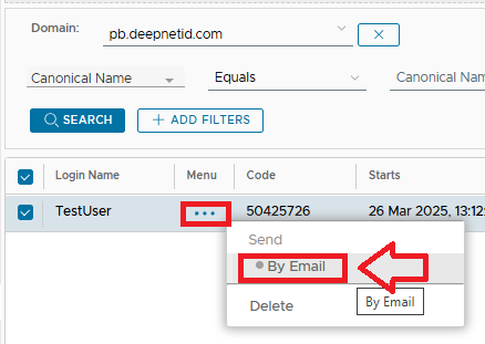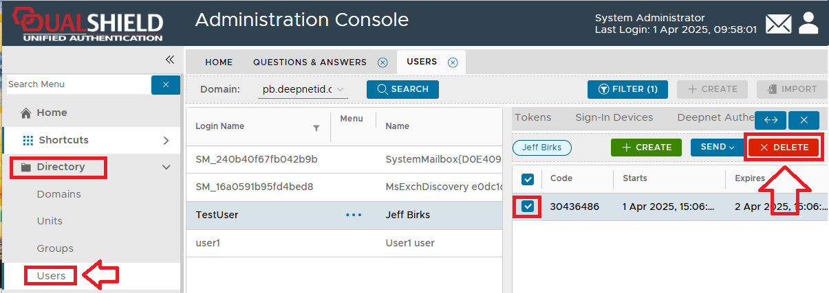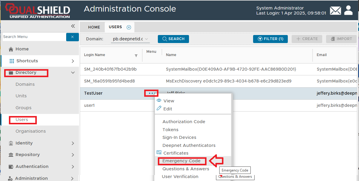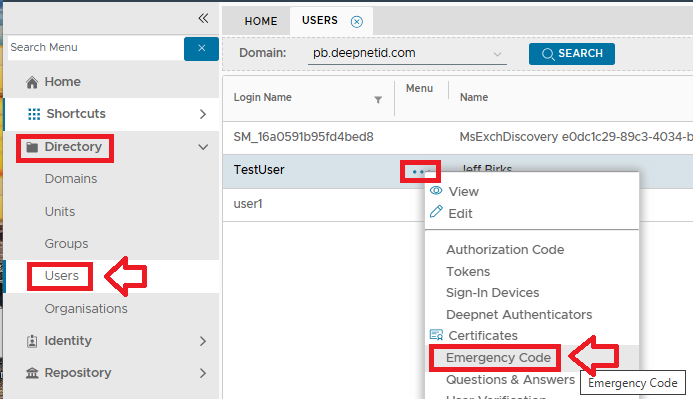 - Navigate to "Directory | Users", select the domain, search for the user to issue the code to, select the emergency code to be send then click on the