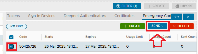 - We can send Emergency Codes to the users either by using the context menu option "Send" from the Emergency Code repository, or by using the