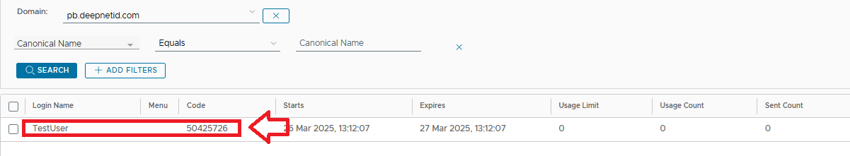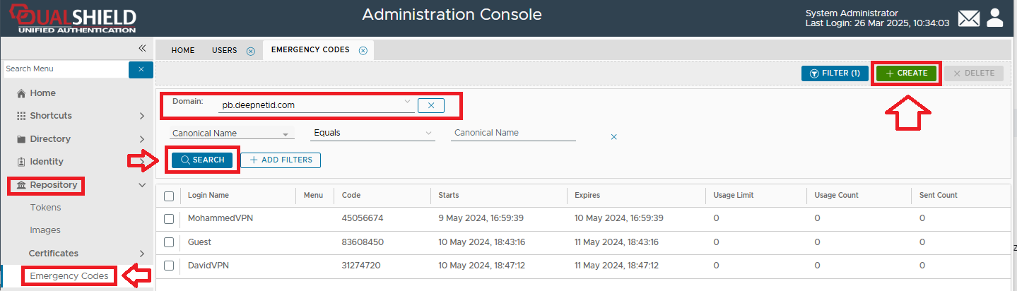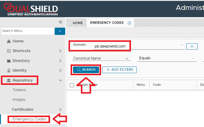 - Navigate to "Repository | Emergency codes", select the domain, then click on the